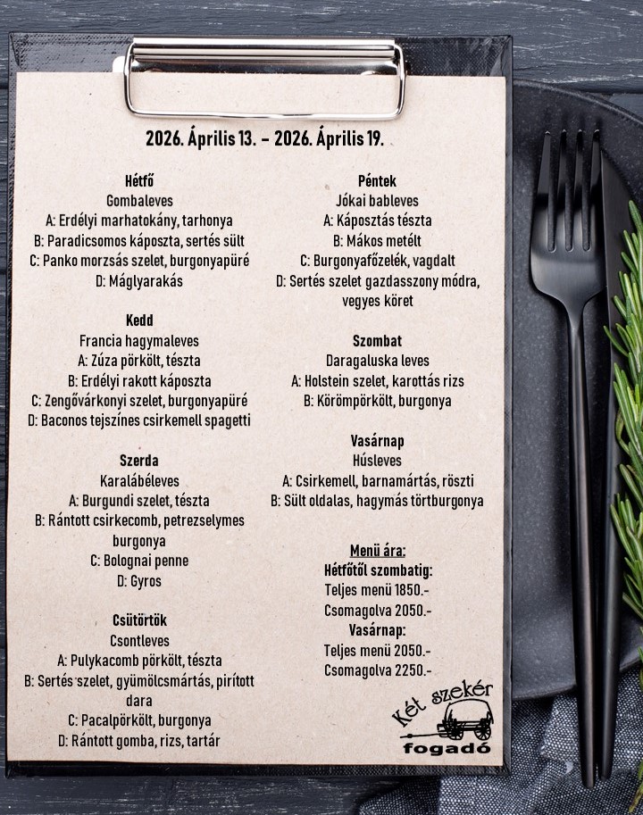 Teljes menü ára Hétfőtől szombatig: 1850.- Csomagolva 2050.-
